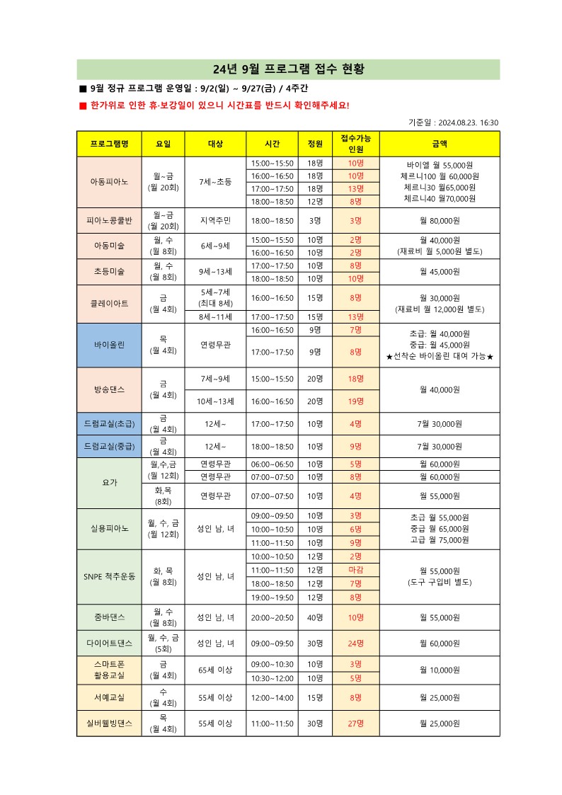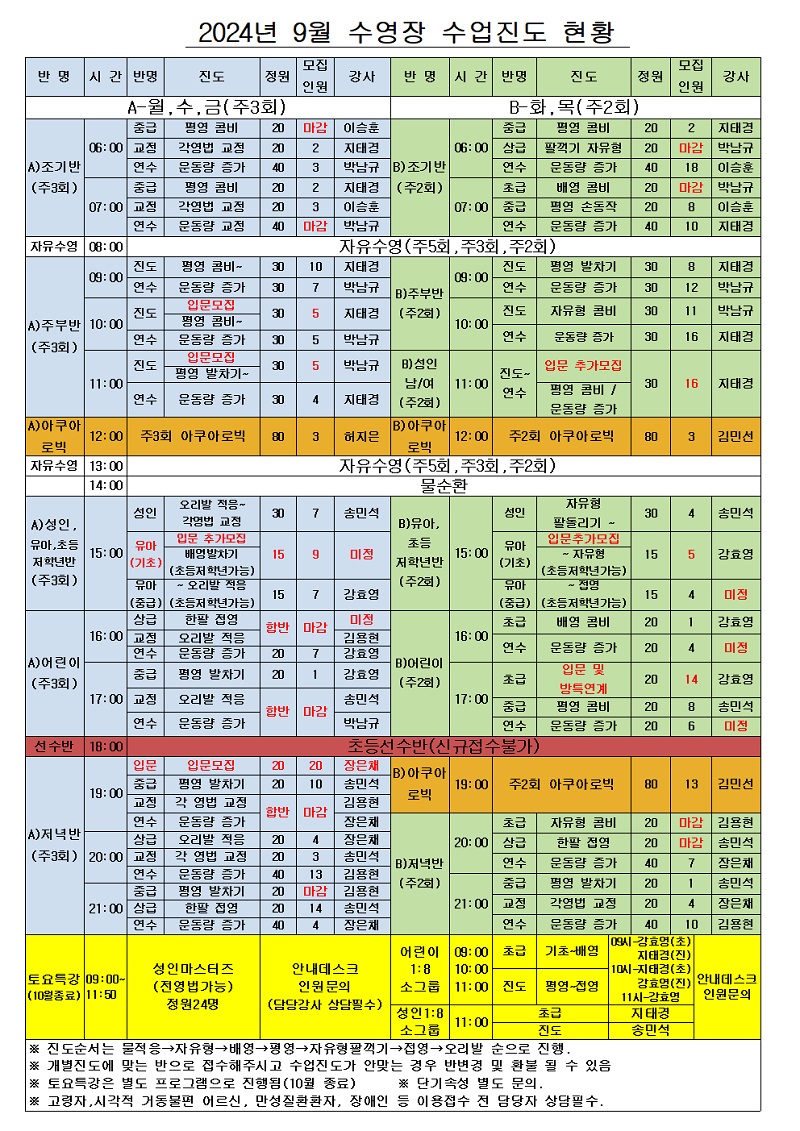 ★2024년 9월 프로그램 진도현황 및 신규모집 현황(수영, 교육문화)★