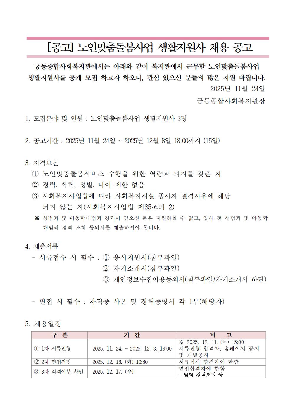 2025년 노인맞춤돌봄사업 생활지원사 채용 공고