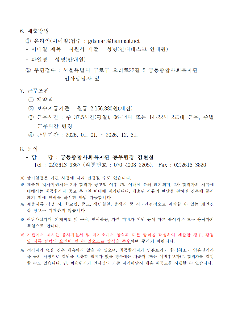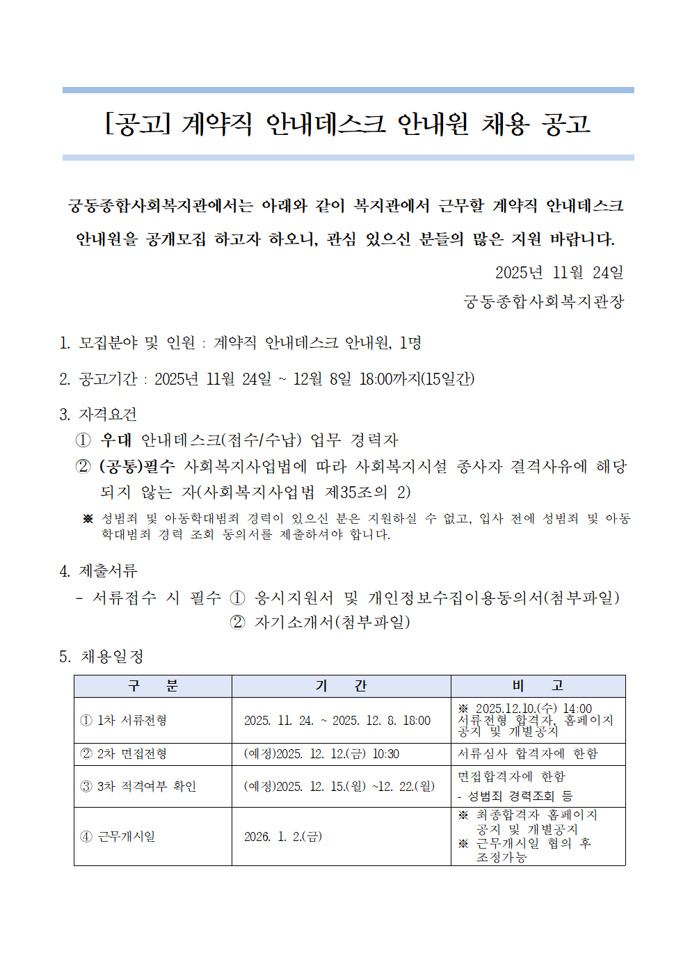 2025년 11월 계약직 안내데스크 안내원 채용 공고