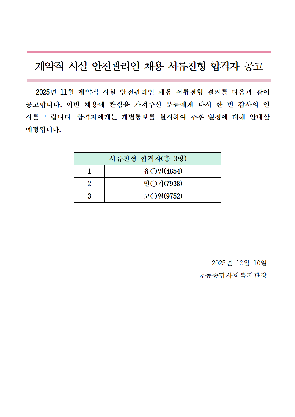 2025년 11월 계약직 시설 안전관리인 채용 서류전형 합격자 공고