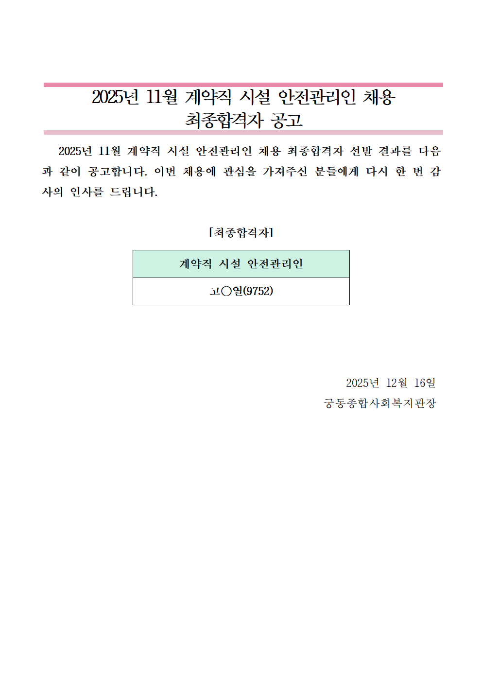 2025년 11월 계약직 시설 안전관리인 채용 최종합격자 공고