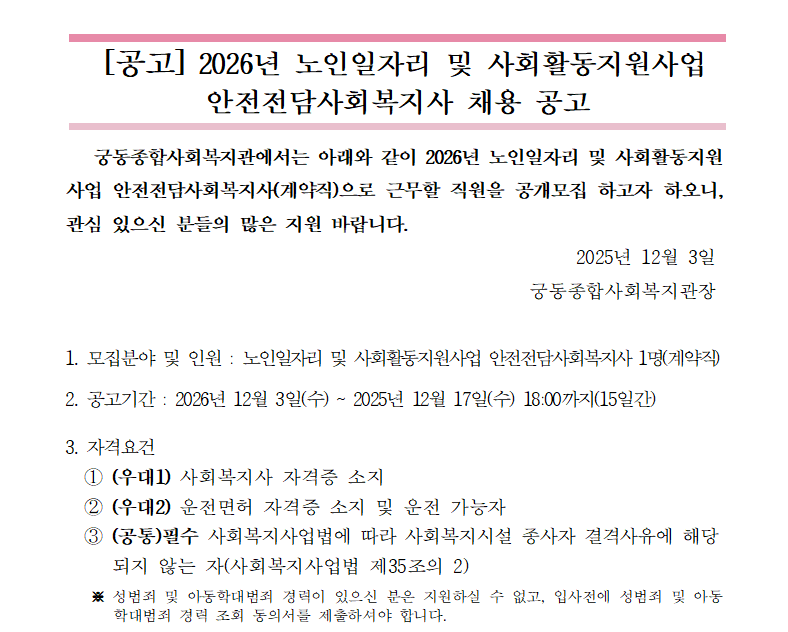2026년 노인일자리 및 사회활동지원사업 전담사회복지사 채용 공고