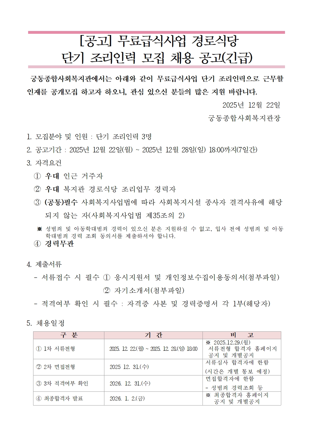 2026년 무료급식사업 경로식당 단기 조리인력 모집 채용 공고(긴급)