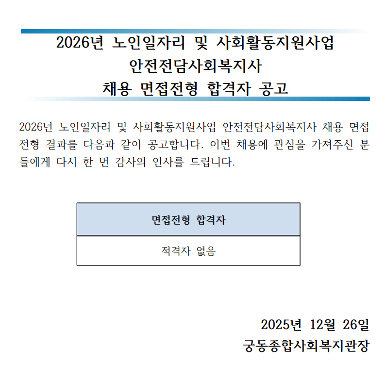 2026년 노인일자리 및 사회활동지원사업 안전전담사회복지사 채용 면접전형 합격자 공고