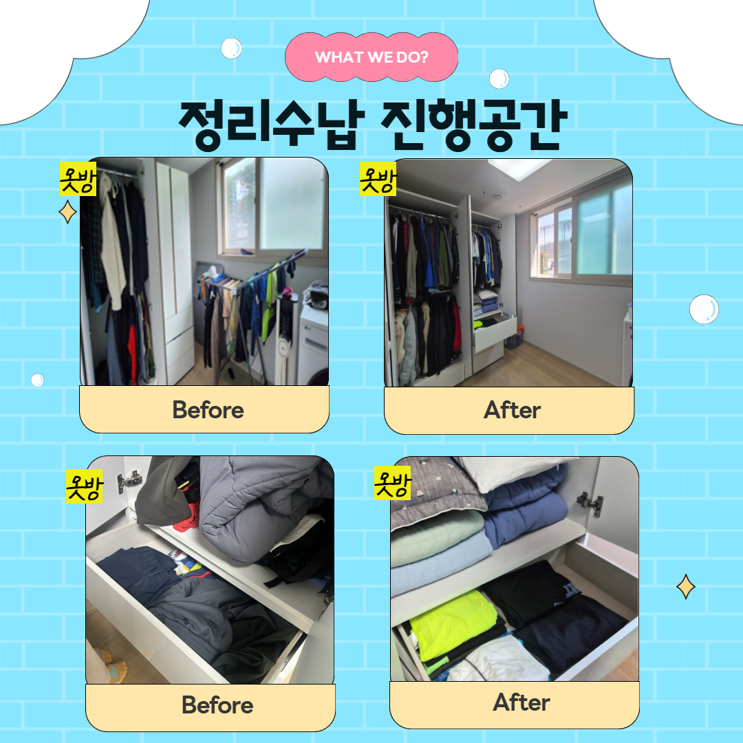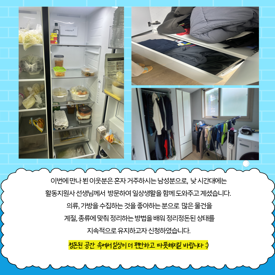의류, 가방등을 수집하시는 것을 좋아하는 남성 분의 가정으로 활동지원사 선생님이 정리를 도와주고 있으나,