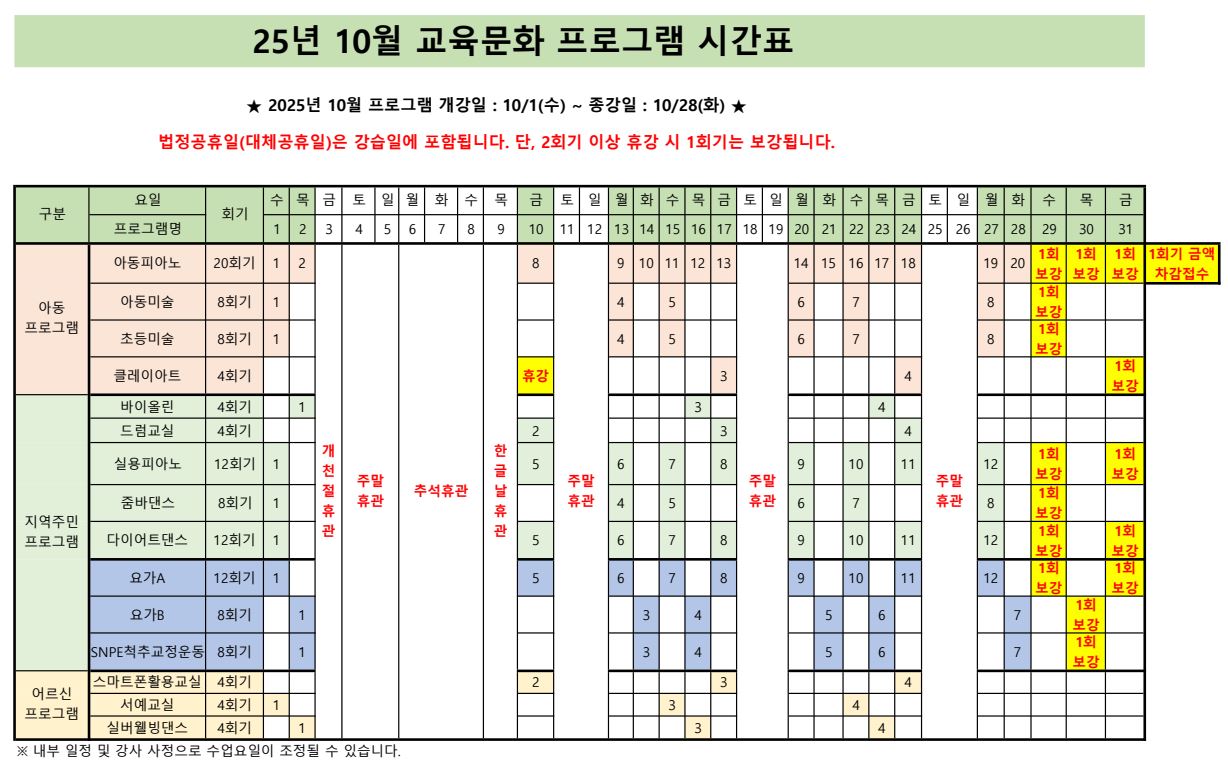 연휴로 인한 복지관 휴강 및 보강 일정을 아래와 같이 안내드리오니, 수강에 참고하시기 바랍니다.