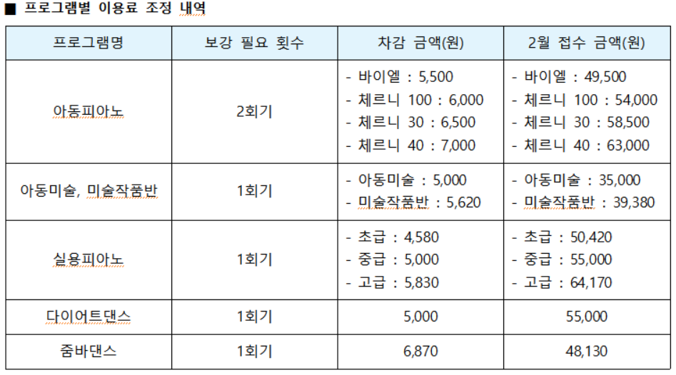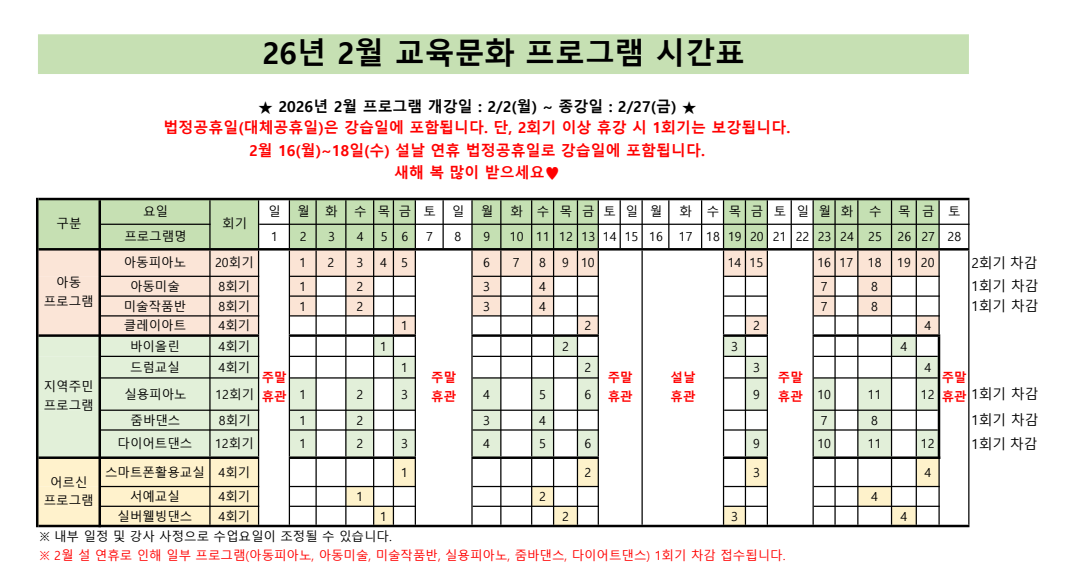 2월 설 연휴로 인해 일부 프로그램 횟수 및 이용료가 조정됩니다.