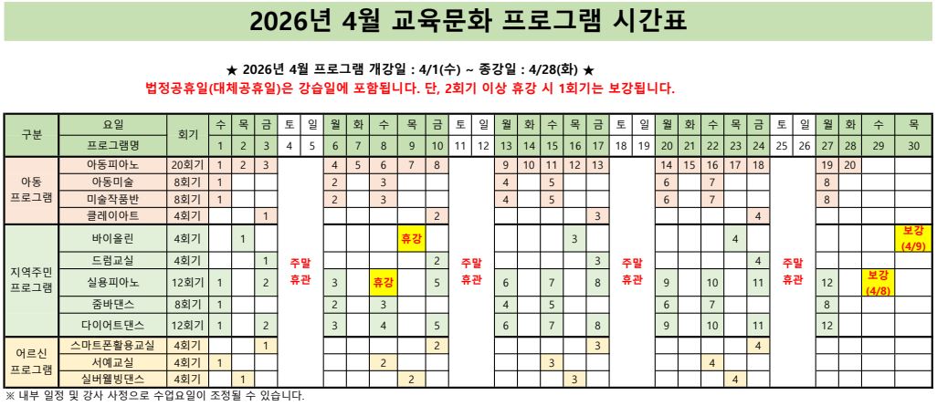 ★2026년 4월 교육문화 프로그램 시간표(수정)★