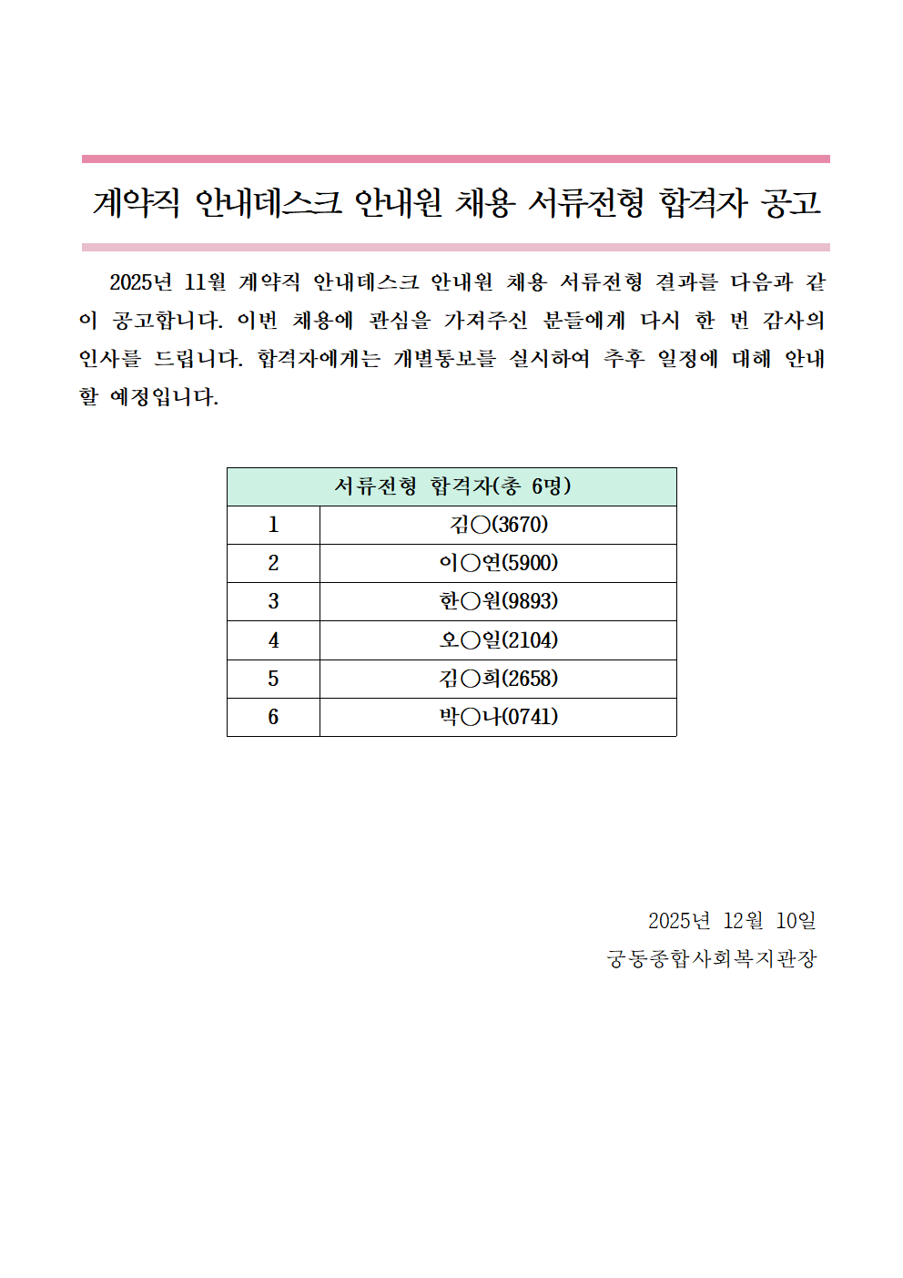 2025년 11월 계약직 안내데스크 안내원 채용 서류전형 합격자 공고