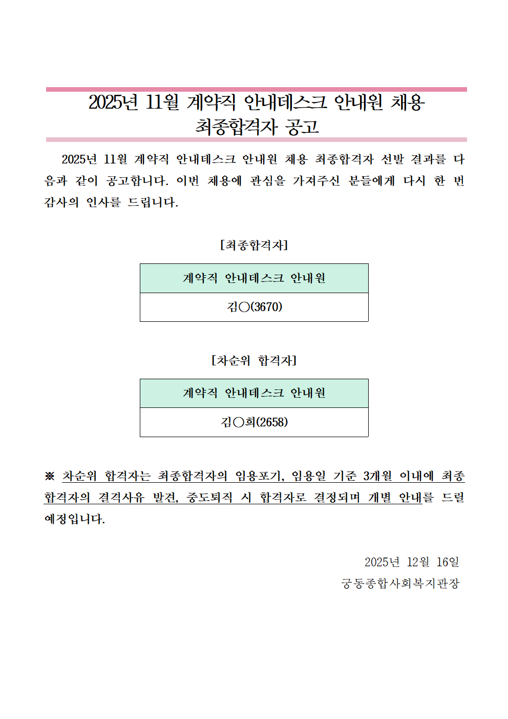 2025년 11월 계약직 안내데스크 안내원 채용 최종합격자 공고