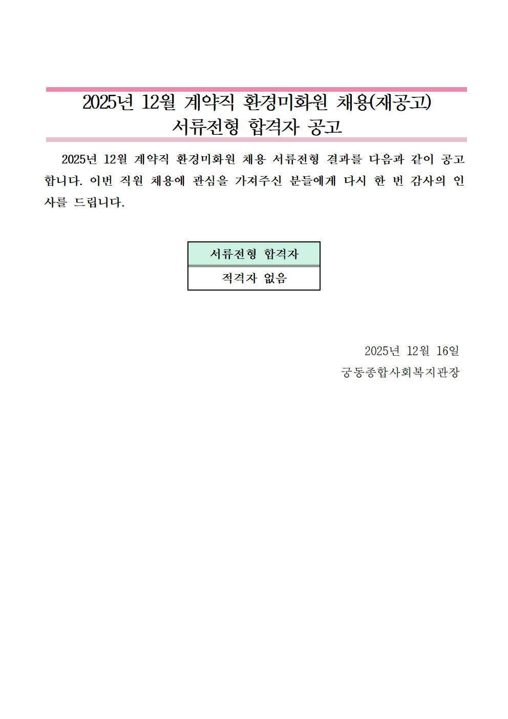 2025년 12월 계약직 환경미화원 채용(재공고) 서류전형 합격자 공고