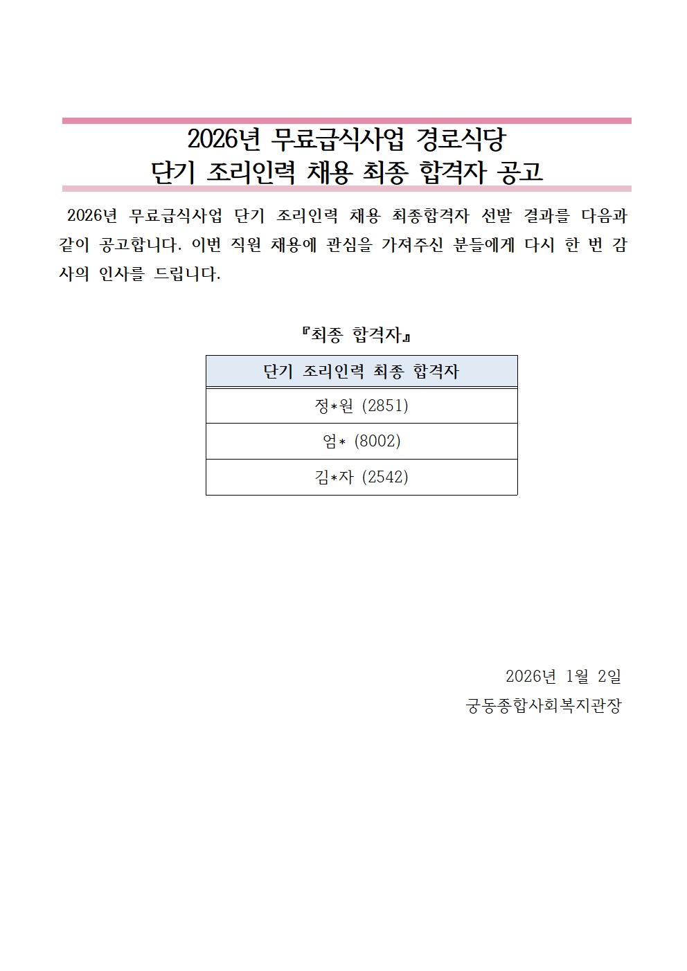 2026년 무료급식사업 경로식당 단기 조리인력 채용 최종 합격자 공고