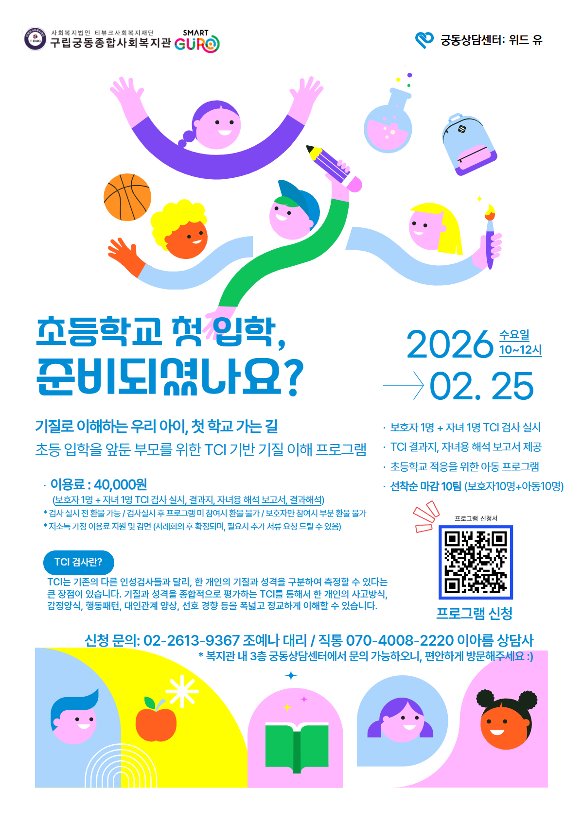 본 프로그램은 보호자에게는 TCI 검사 기반의 자녀 기질 이해 교육을, 아동에게는 활동 중심의 초등학교 적응 프로그램을 함께 제공하여 입학 전환기를 보다 안정적으로 준비할 수 있도록 돕습니다.