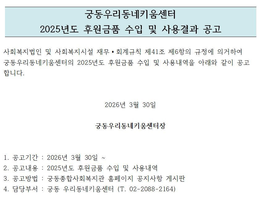2025년 궁동종합사회복지관 후원금품 수입 및 사용 결과보고서 공고