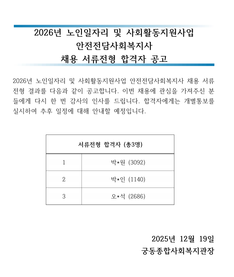 2026년 노인일자리 및 사회활동지원사업 안전전담사회복지사 서류전형 합격자 공고