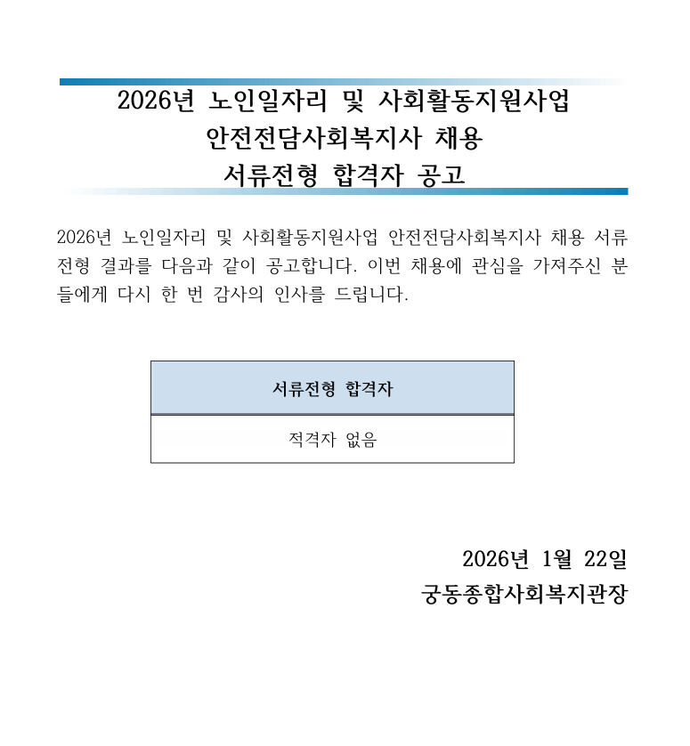 2026년 노인일자리 및 사회활동지원사업 안전전담사회복지사 채용 서류전형 합격자 공고