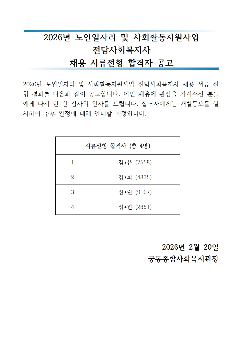 2026년 노인일자리 및 사회활동지원사업 전담사회복지사 채용 서류전형 합격자 공고