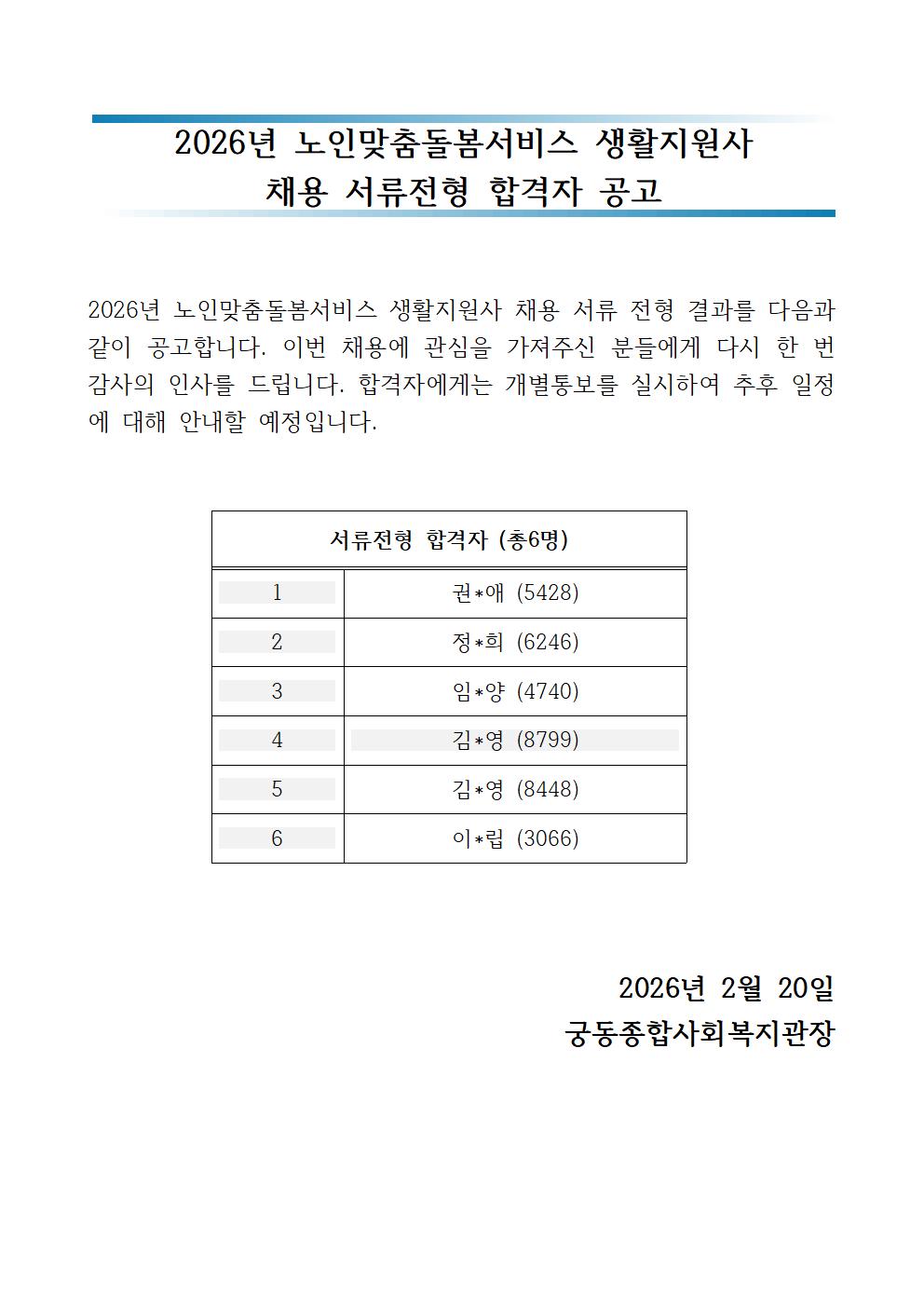 2026년 노인맞춤돌봄사업 생활지원사(계약직) 서류전형 합격자 공고