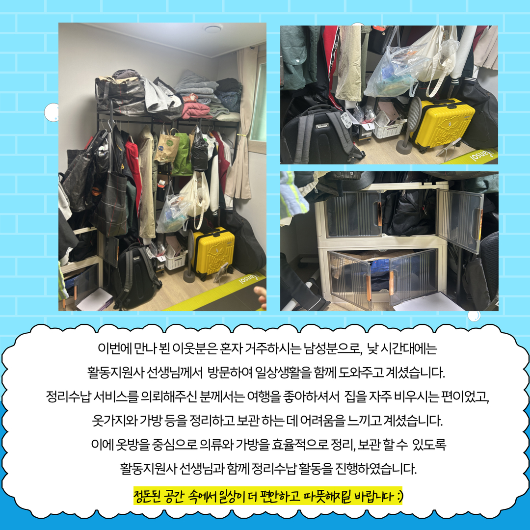 올해 첫 활동으로 신박맘 봉사단의 정리수납 활동이 구로장애인주거지원센터에서 진행되었습니다.
